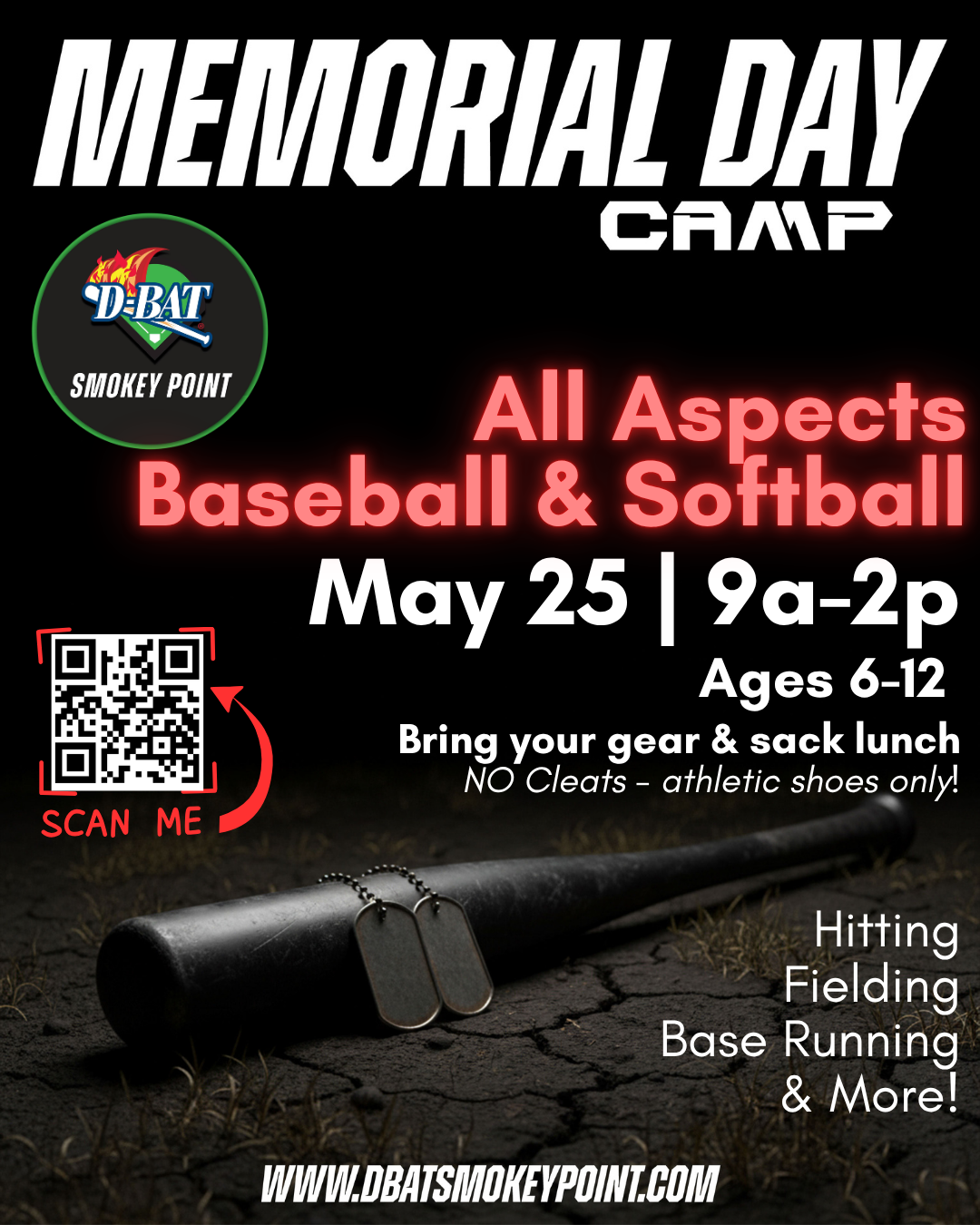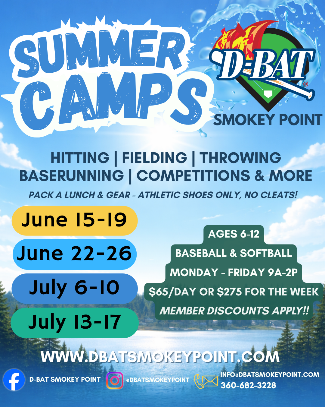 At D-BAT Smokey Point, we host more than 50 Camps, Clinics & Classes each year providing a great opportunity for players to improve while having fun at the same time! Our Spring/Holiday Break and Summer Camps are very popular with parents who are looking for something constructive to keep their ballplayers busy when school is out. Our specialty clinics — typically focused on one aspect of the game — give athletes a chance to fine-tune established skills or work on problem areas. For the latest information on our camps and clinics see our camp fliers below.